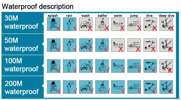 Watches are 30M waterproof(life waterproof),only can  splash a little water,can’t be washed or in bathing,swimming,diving.